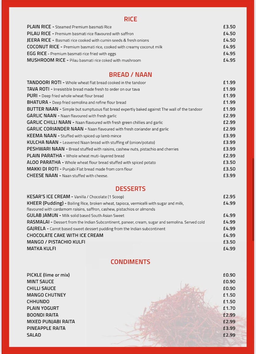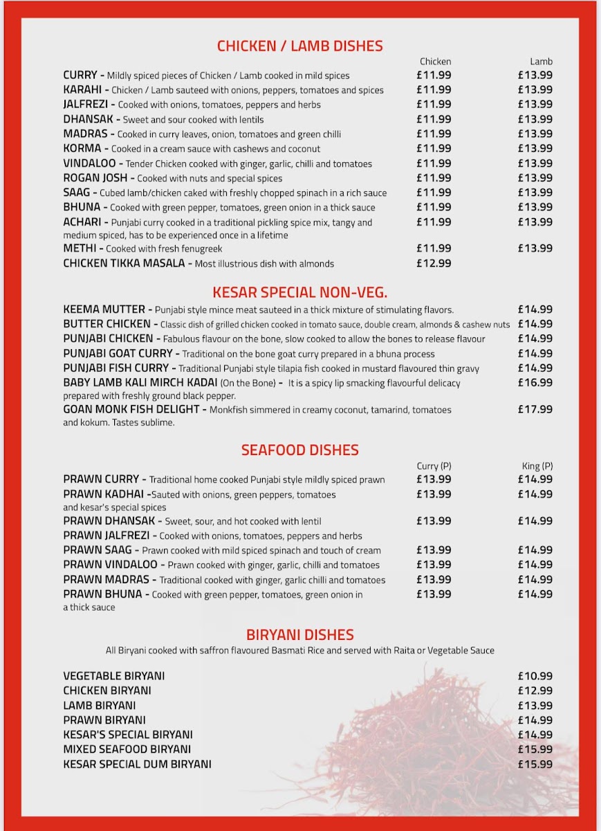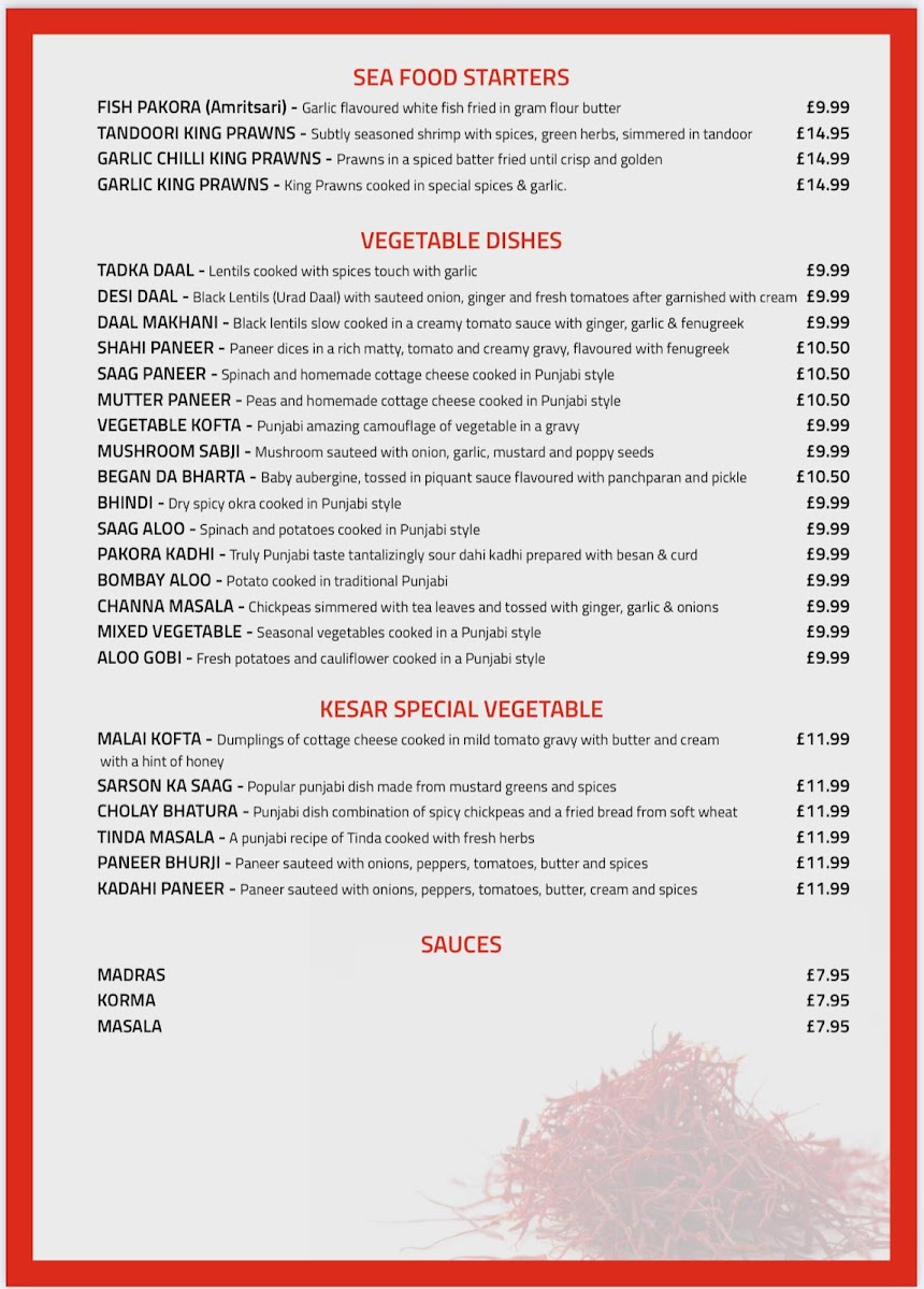 Kesar II Punjabi Restaurant - Bexleyheath Menu
