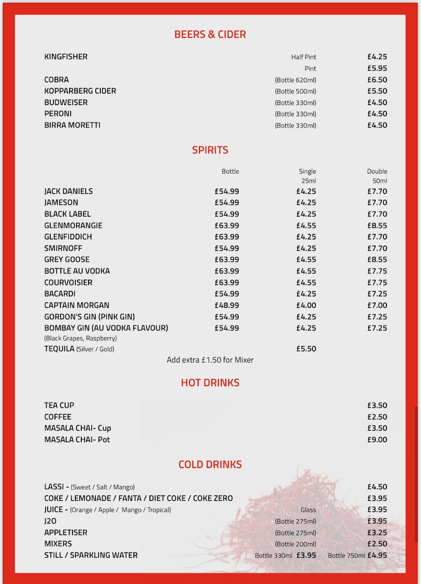 Start with flavorful starters like Vegetable Samosa or Fish Pakora, perfect for sharing or a light snack. The heartier mains, such as Goat Curry, Chicken Biryani, or Dal Tadka, provide satisfying warmth ideal for lunch or dinner in a welcoming setting. Complement your meal with fresh sides like Chilli Garlic Naan or a Green Salad, balancing the rich spices and textures.